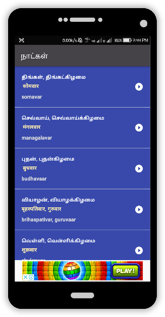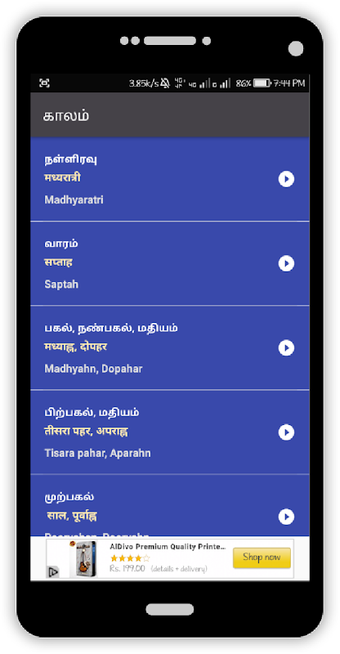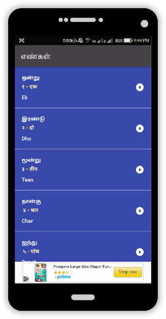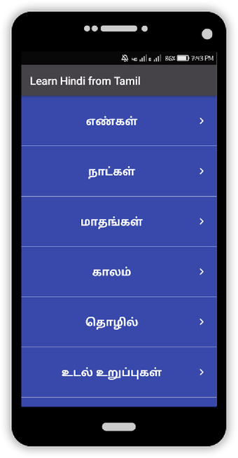يعلم التطبيق الكلمات الهندية الأساسية من خلال التاميل ويشمل فئات مثل الأرقام، الأيام، الشهور، أجزاء الجسم، الأمراض، العلاقات، الأجهزة المنزلية، الحلي، الآلات الموسيقية، المواد الغذائية، الحيوانات، الطيور، الزهور، الحشرات، الملابس، الأدوات، القرطاسية، والكلمات الشائعة. يهدف التطبيق إلى توفير وسيلة سهلة للمستخدمين لتعلم الهندية، خاصة لأولئك الذين يتحدثون التاميل.